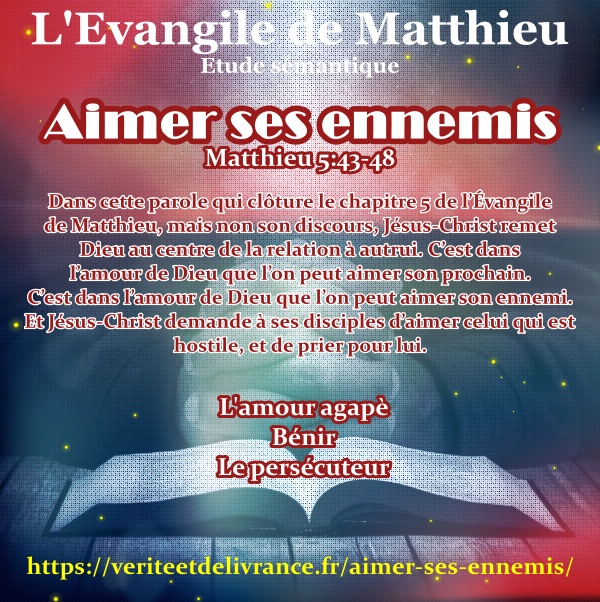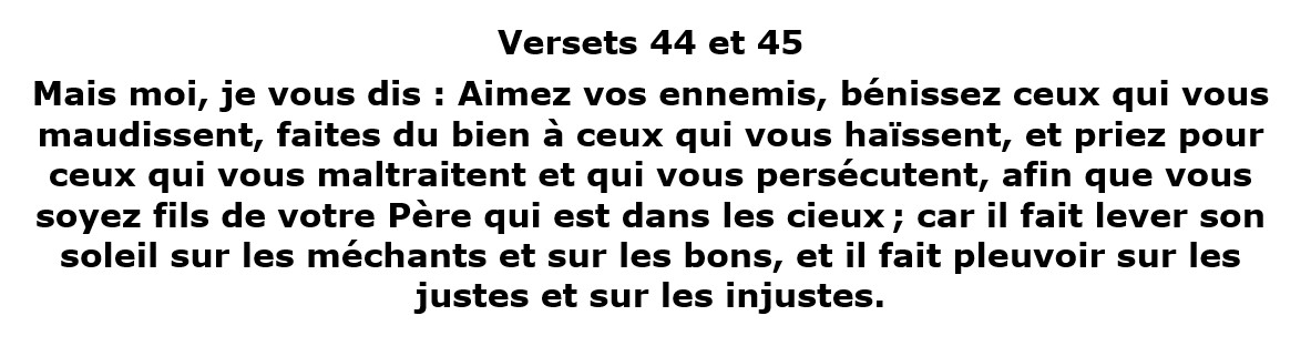 Dans cette parole qui clôture le chapitre 5 de l’Évangile de Matthieu, mais non son discours, Jésus-Christ remet Dieu au centre de la relation à autrui. C’est dans l’amour de Dieu que l’on peut aimer son prochain. C’est dans l’amour de Dieu que l’on peut aimer son ennemi. Et Jésus-Christ demande à ses disciples d’aimer celui qui est hostile, et de prier pour lui.