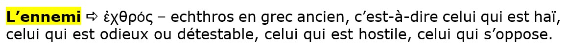 Et l’ennemi en question, c’est ἐχθρός – echthros mot que nous avons vu plus haut, celui qui est haï, celui qui est odieux ou détestable, celui qui est hostile, celui qui s’oppose.