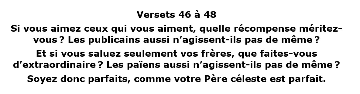 ⁴⁶Si vous aimez ceux qui vous aiment, quelle récompense méritez-vous ? Les publicains aussi n’agissent-ils pas de même ?