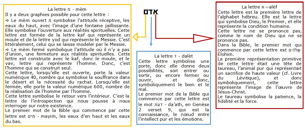 Dans ce mot אדם – adam, nous avons le mot דם – dam, mot qui signifie le sang et ce qui est semblable et homogène. Comme la première lettre est א – alèf, la lettre qui désigne le Premier, donc Dieu, le Principe, l’Alpha, on comprend alors que Adam est de même nature que Dieu, c’est-à-dire d’une nature spirituelle.