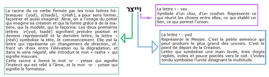 La racine de ce verbe formée par les trois lettres hébraïques י (yod), צ (tsadè), ר (rèsh), a pour sens former, façonner et aussi imaginer. Ainsi, on a l’image du potier qui imagine sa création et qui la forme grâce à de la matière, qui la modèle, qui la façonne. Les deux premières lettres יצ (yod, tsadè) signifient prendre position et devenir représentatif et la dernière lettre, la lettre ר (rèsh) symbolise la tête, le commencement. Elle est la lettre qui représente un changement de direction, offrant un choix entre l’élévation ou la dégradation, et dans le sens négatif, elle introduit le mot « rasha » qui signifie mauvais.