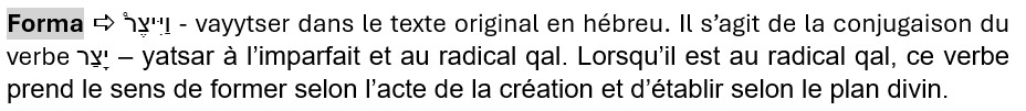 Dans le texte en hébreu, ce verbe est le premier mot du verset 7 auquel on a ajouté la lettre ו (vav) qui est, en hébreu, la conjonction de coordination et. Ainsi, il faudrait lire « Et forma Yahvéh Elohim l’homme de la poussière… »