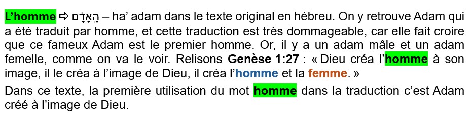 Ainsi, littéralement, il faudrait lire : « Dieu créa l’adam à son image, il le créa à l’image de dieu, il créa l’adam mâle et l’adam femelle. »