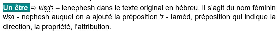 Ainsi, l’homme, l’Adam est rendu vivant par le souffle de Dieu. Son âme est rendue vivante, ainsi que son esprit. Il reçoit les deux vies, celle de l’âme et du corps, et celle de l’esprit. Il n’est plus un simple être, dans le sens נֶפֶשׁ – nephesh, mais il est une âme vivante, c’est-à-dire un esprit qui guide l’âme.