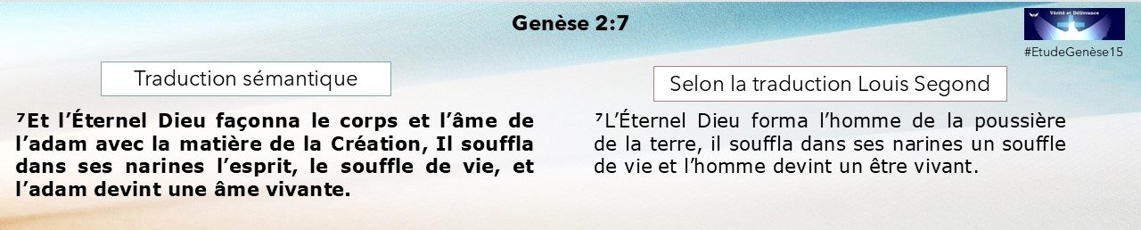 Ce verset 7 de Genèse 2 est un verset particulièrement riche en enseignement, et les traductions françaises ne redonnent pas entièrement le sens de ce verset. En même temps, il est très difficile de transmettre tout cet enseignement dans une traduction, on perd forcément un peu de sens. On verra, dans la suite de nos études, que Dieu va placer cet être vivant qu’Il vient de créer dans le jardin d’Eden, et l’on va comprendre ce qu’était ce jardin.