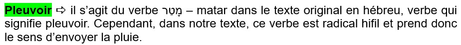Ainsi, Dieu n’avait pas encore envoyé la pluie, l’eau qui permet de croître. On y voit une préfiguration du baptême d’eau, qui est un baptême de repentance, et donc le point de départ de la croissance spirituelle, de la croissance de l’enfant de Dieu. C’est Jésus-Christ, l’eau vive, qui permet de croître, de grandir spirituellement, par sa Parole.