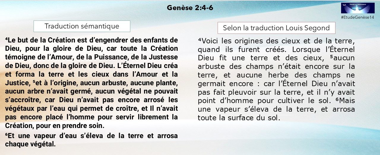 Ces quelques versets viennent après le récit du 7e jour, comme un flash-back de l’état de la Création avant le 7e jour. On y voit comme un retour en arrière, une remontée dans le temps au premier jour de la Création. Ces quelques versets sont un rappel de ce qui s’est passé avant pour arriver au 7e jour : formation de la Terre, formation de l’univers aux 1er et 2e jours de la Création (Il fit une terre et des cieux), formation des végétaux au 3e jour de la création. Et ici précisément, il nous est dit qu’aucune herbe des champs ne germait encore, car il n’y avait pas de pluie et pas d’hommes pour cultiver le sol. Alors Dieu fit s’élever une vapeur sur la terre, la nuée.