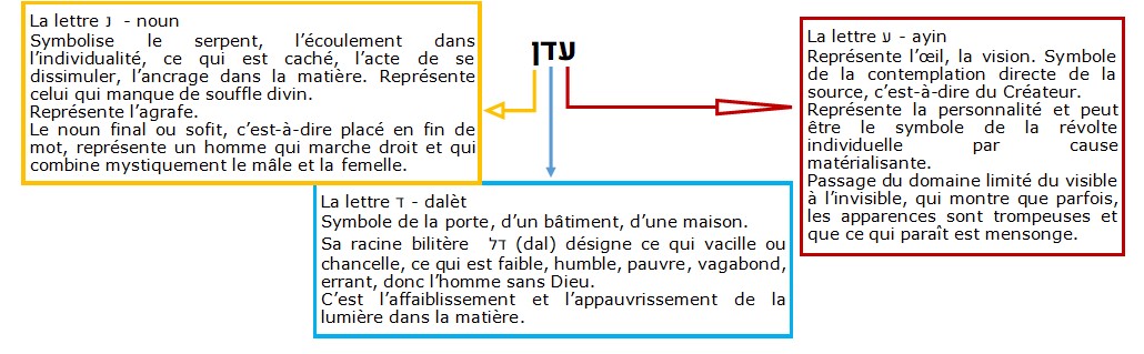 Regardons à présent la signification du mot עֵדֶן – èden. Il s’agit d’un nom propre locatif qui signifie plaisir, délices. Ce jardin se trouve donc en Éden, un lieu de plaisir et de délices. Analysons les trois lettres hébraïques de ce mot :