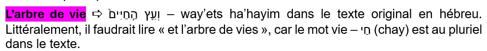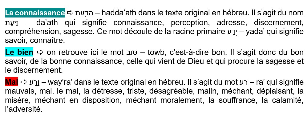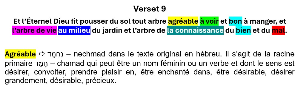 Enfin, au verset 9, Dieu place l’homme dans le jardin et fait pousser des arbres qui sont agréables à voir et bons à manger, et Il place l’arbre de vie et l’arbre de la connaissance du bien et du mal. Ainsi, dès le départ, Dieu a placé l’arbre de la connaissance du bien et du mal. Pourquoi ? Pourquoi Dieu a-t-il placé cet arbre qui va provoquer la chute de l’homme ? Et que représente l’arbre de vie ? Ces deux arbres, l’arbre de vie et l’arbre de la connaissance du bien et du mal, d’après le texte, ne sont ni agréables à regarder ni bons à manger. C’est ce que l’on comprend lorsqu’on lit ce texte rapidement. Mais quand on s’intéresse à ce qui est vraiment écrit, en hébreu, au texte original, est-ce vraiment ce qu’il est écrit ? Voyons tout cela en détail.