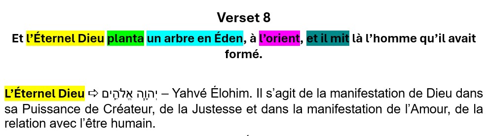 On se souvient, au verset précédent, le verset 7, Dieu a créé et formé l’adam, l’être humain, et Il le place dans le jardin d’Éden.