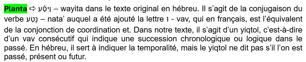 Revenons à notre verbe planter. Dans notre texte, il s’agit du verbe נָטַע – nata’ qui signifie planter, attacher, fixer, établir. Dans le texte, ce verbe est au radical qal, donc il garde le sens de planter et d’établir, mais au figuré. Ainsi, Dieu ne s’est pas transformé en jardinier, en plantant au sens littéral un arbre. Et l’on verra que ce qui est « planté » n’est pas un arbre, mais tout un jardin. Dieu a formé un jardin en Éden pour y placer l’homme. Il n’a pas pris sa pelle et son arrosoir, mais Il a fait pousser un jardin pour y mettre l’être humain. Tout a été fait par Dieu pour accueillir l’être humain.