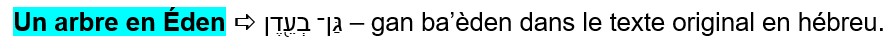 Le mot גַּן – gan signifie un jardin, un enclos. Ce mot découle de la racine primaire גָּנַן – ganan qui est un verbe dont le sens est défendre, couvrir, entourer, protéger. Ainsi, on comprend qu’il ne s’agit pas d’un arbre, mais de tout un jardin qui a été formé sur Éden pour protéger l’être humain, pour l’entourer d’une protection.