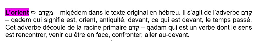 Une autre question nous vient à l’esprit : pourquoi nous est-il précisé que ce jardin est du côté de l’orient ? Dans la Bible, rien n’est écrit pour donner du style au texte, chaque mot est inspiré de Dieu.