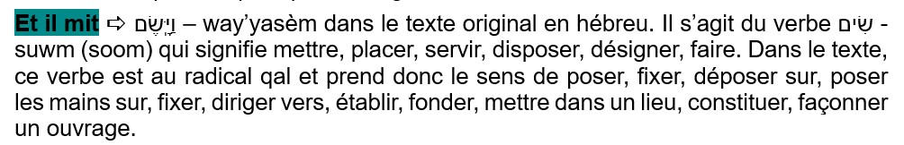 Rappelons que le but de ces études est de donner le sens le plus proche possible du texte du Livre de la Genèse, donc de la Parole de Dieu. Dans ces études, nous nous attarderons essentiellement sur les mots hébreux dont le sens n’a pas été correctement restitué ou parfois même inversé par les traductions françaises qui sont à notre disposition, afin de pouvoir donner le sens véritable du texte, sans le prisme d’une doctrine ou d’une idéologie religieuse.