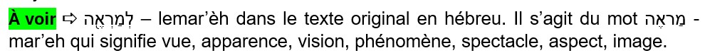 Ce mot découle de la racine primaire רָאָה – ra’ha qui est un verbe dont les sens est voir, regarder, examiner, inspecter, apercevoir, considérer. Ainsi, tous ces arbres sont très beaux à regarder, mais Dieu invite l’être humain à les examiner. Et l’on verra, plus tard dans ces études du Livre de la Genèse, que Dieu enseignait l’être humain sur la botanique, la biologique… toutes sortes de sciences. Il invitait l’Adam à regarder la création et Il l’enseignait sur tout ce qu’il voyait.