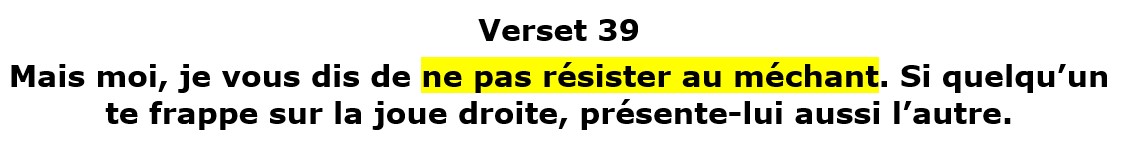 Ce verset, très mal compris et très mal interprété, ne signifie pas qu’il faut, lorsque l’on se fait frapper, en redemander. En vérité, il signifie que si un méchant nous offense, il ne faut pas lui résister.