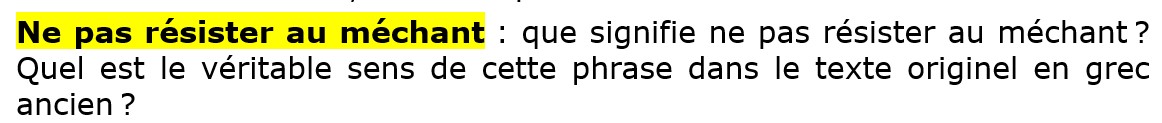 Dans le texte grec originel, le verbe ἀνθίστημι – anthistemi est à l’aoriste passif et à l’infinitif. C’est-à-dire que ce que dit ici Jésus-Christ est valable tout le temps, et pour tous les moments de notre vie. Et le fait que le verbe est au passif, cela signifie que c’est avec l’aide de l’Esprit Saint que l’on va puiser la force de ne pas résister au méchant.