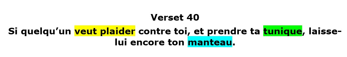 ⁴⁰Si quelqu’un veut plaider contre toi, et prendre ta tunique, laisse-lui encore ton manteau.