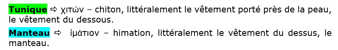 Ainsi, peu importe la situation, le moment, l’occasion, si quelqu’un plaide contre nous et veut prendre notre tunique, on lui donne aussi son manteau.