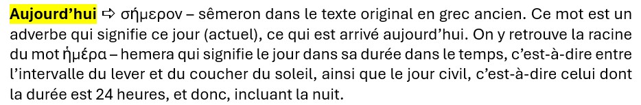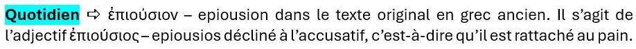 Le dictionnaire le Grand Bailly donne la définition « du jour suivant » pour ἐπιούσιος – epiousios.