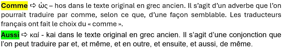 Dans quasiment toutes les traductions que nous avons de la Bible en français, nous avons cette phrase qui implicitement nous fait croire que c’est parce que nous avons pardonné aux autres, que Dieu va nous pardonner nos péchés, comme si, quelque part, Dieu ne pourrait pas agir et qu’Il attendrait qu’on agisse pour agir à son tour. Comme si le pardon de Dieu viendrait à la suite de notre pardon aux autres. D’abord, nous on pardonne, et après Dieu peut nous pardonner. Si on ne pardonne pas, alors Dieu ne peut pas nous pardonner. Penser ainsi, c’est enlever la souveraineté de Dieu, c’est croire que Dieu n’est pas souverain, mais tributaire d’une décision d’un homme. Et on va voir que deux seuls petits mots dans cette traduction ont fait changer tout le sens du texte, et ces petits mots, ce sont « comme » et « aussi ».
