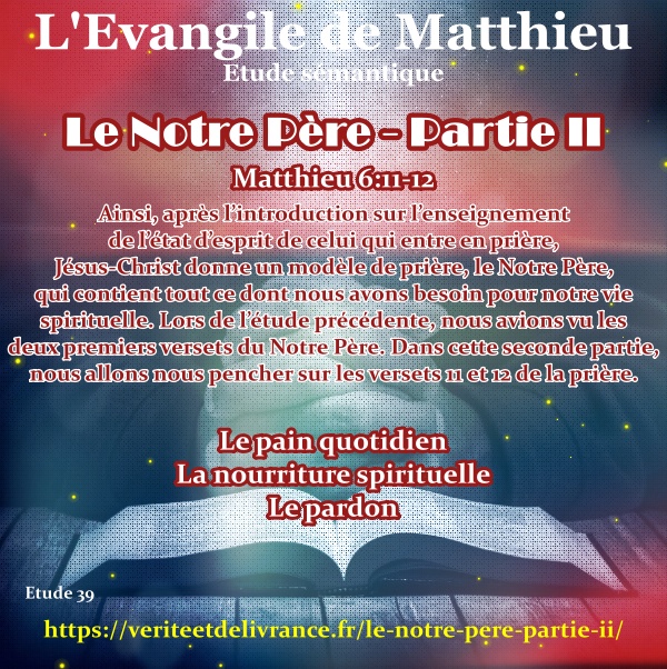 Ainsi, après l’introduction sur l’enseignement de l’état d’esprit de celui qui entre en prière, Jésus-Christ donne un modèle de prière, le Notre Père, qui contient tout ce dont nous avons besoin pour notre vie spirituelle. Lors de l’étude précédente, nous avions vu les deux premiers versets du Notre Père. Dans cette seconde partie, nous allons nous pencher sur les versets 11 et 12 de la prière.