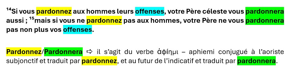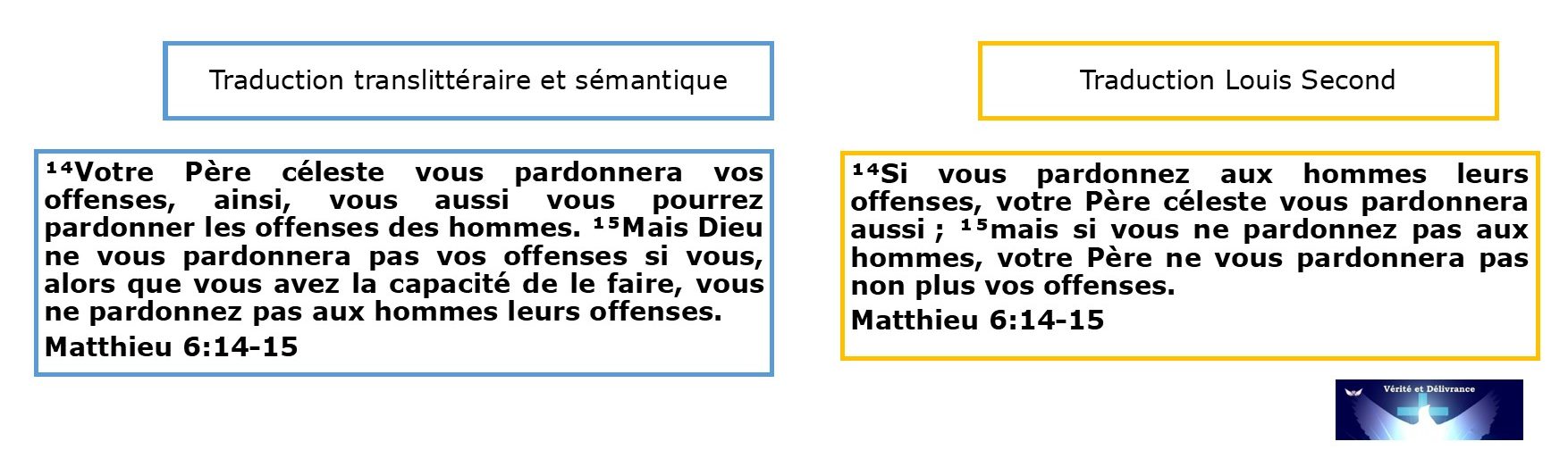 Littéralement, ces deux versets devraient se lire ainsi : « Votre Père céleste vous pardonnera vos offenses, ainsi, vous aussi vous pourrez pardonner les offenses des hommes. Mais Dieu ne vous pardonnera pas vos offenses si vous, alors que vous avez la capacité de le faire, vous ne pardonnez pas aux hommes leurs offenses. »