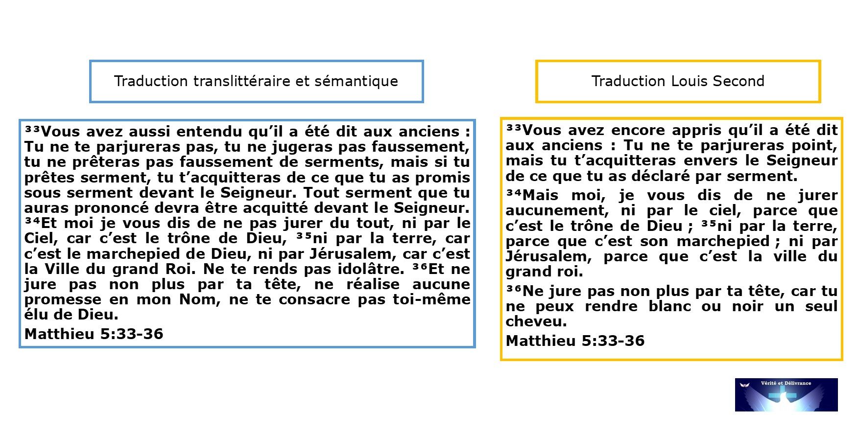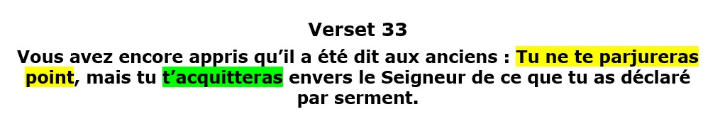 ³³Vous avez encore appris qu’il a été dit aux anciens : Tu ne te parjureras point, mais tu t’acquitteras envers le Seigneur de ce que tu as déclaré par serment.