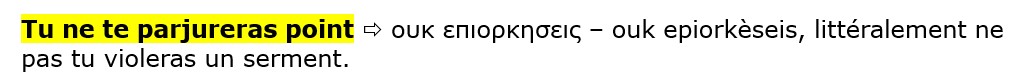 Ici, on retrouve le parjure dans le sens ἐπίορκος – epiorkos, on retrouve l’adverbe qui découle du verbe ἐπιορκέω – epiorkeo. Et Paul rappelle que la Loi n’est pas faite pour les justes, car naturellement le juste qui vit de la foi, aime Dieu et aime son prochain comme lui-même, donc naturellement le juste fait le bien. La loi est faite pour les mauvais, afin de montrer le mal qu’ils commettent, de dévoiler leur état de pécheur. Le but de la loi est de mettre en évidence le péché. Et être un parjure est faire le mal, puisqu’on ment aux autres et aussi à soi-même.