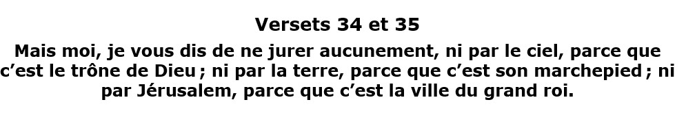 ³⁴Mais moi, je vous dis de ne jurer aucunement, ni par le ciel, parce que c’est le trône de Dieu; ³⁵ni par la terre, parce que c’est son marchepied; ni par Jérusalem, parce que c’est la ville du grand roi.