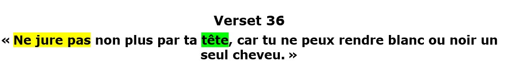 ³⁶Ne jure pas non plus par ta tête, car tu ne peux rendre blanc ou noir un seul cheveu.