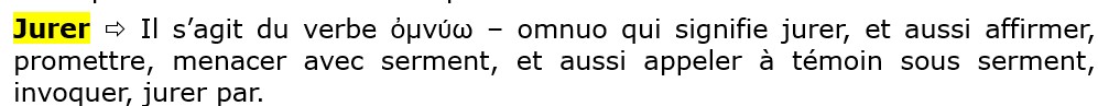 Dans notre étude, Jésus-Christ va expliciter ce qu’est le parjure, et donc le fait de ne pas donner de faux témoignage pour faire tomber un innocent, et Il revient aussi sur la notion de jurer, c’est-à-dire de promettre solennellement, par serment, quelque chose. Jurer peut aussi revêtir le sens d’affirmer fortement quelque chose et aussi le sens de passer un serment.