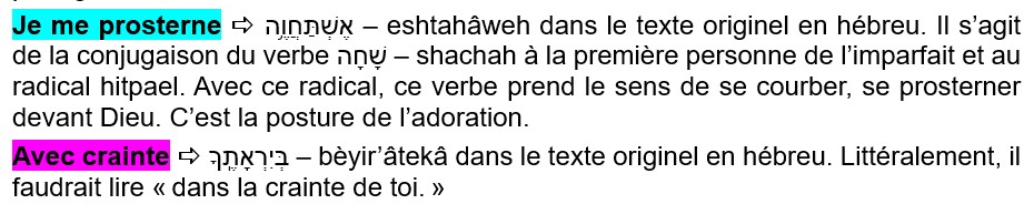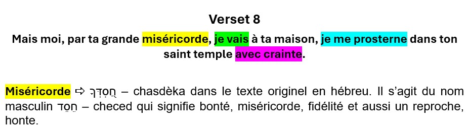 Ainsi, David ne dit pas qu’il est meilleur que les autres. Il reconnaît qu’il est lui aussi un pécheur, et comme il reconnaît son état misérable et s’en repend, il sait que Dieu est fidèle et plein de grâce, et c’est pour cela qu’il peut dire qu’il peut entrer dans sa maison. Sans cette grâce que Dieu lui donne, il ne peut entrer dans la maison de Dieu.