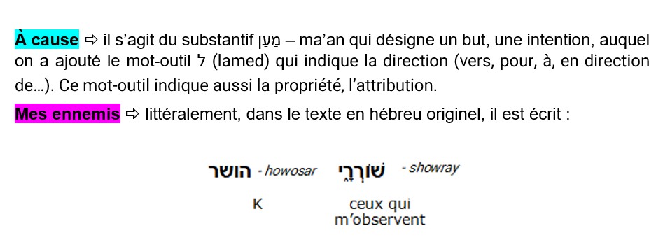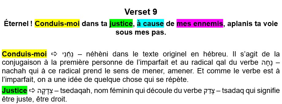 La fin du verset est compréhensible dans sa traduction : David demande à Dieu d’aplanir son chemin, de rendre droit devant lui son chemin, dans l’idée qu’il ne trébuche pas, car ses ennemis l’observent, et ne manqueront pas de l’assaillir dès le premier faux pas.
