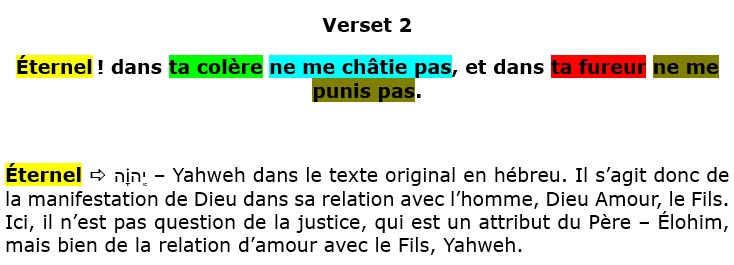 Quand on lit ces quelques versets, on a l’impression que David s’adresse à un dieu colérique, et qu’il supplie ce Dieu de ne pas lui faire du mal. Les traductions françaises qui découlent le plus souvent de la Vulgate, la traduction latine du texte hébreu, ou de la Septante, dépeignent un dieu capricieux et puissant, à l’image des divinités grecques, capables de punir les humains pour leurs péchés, des divinités jalouses, colériques, irritables, exigeantes. Et à la lecture littérale de ces premiers versets, on a l’impression que David supplie un dieu irritable, colérique, exigeant de ne pas le punir, de ne pas le châtier, et au contraire, de le guérir. Qu’en est-il en réalité ? Penchons-nous sur ces versets afin d’en ressortir leur véritable sens.