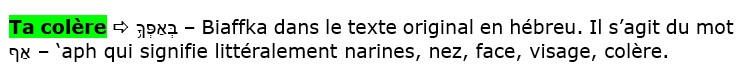 Ce mot אַף – ‘aph est un élément qui met en évidence la réaction de quelqu’un qui est face à une personne, face à un duel avec une personne. Ce qui est ressenti comme de la colère, c’est justement de se tenir face à Dieu dans une position d’opposition, de vouloir tenir sa position alors que l’on sait que l’on a tort, ou que l’on a fait du mal à cette personne. Littéralement, cette colère que l’on ressent, c’est celle d’être mis face à la vérité, face à sa faute, sans aucune échappatoire.