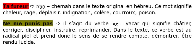 Littéralement, David demande à Dieu de ne pas l’instruire par son indignation, en lui montrant son déplaisir. Or, quand quelqu’un est indigné, il limite la relation. Et David s’adresse à l’Éternel, le Dieu de la relation. Donc, littéralement, David dit : « ne m’instruis pas dans la limitation de notre relation. »