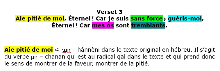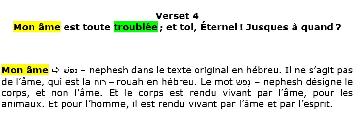 Que dit littéralement David ? Il dit : « Aie pitié de moi Éternel ! Car mon esprit est accablé de douleur, je suis sans force. Délivre-moi de ma détresse, Eternel ! Car tout mon être est terrifié. »