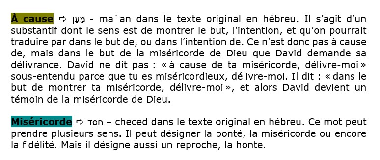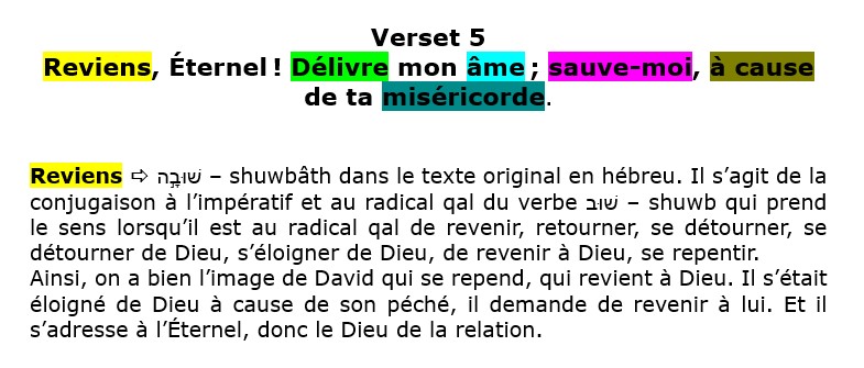 Ces deux versets expriment un gémissement. David ne crie plus, il gémit, car il a pris conscience de sa faute, et il a peur de mourir. C’est pourquoi, dans un dernier souffle, il demande à Dieu de l’aider, de le délivrer.