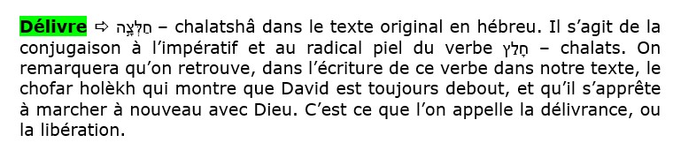 Notons aussi la présence du revi’i que nous avons déjà vu lors de l’introduction au psaume 6. Ce signe montre que le ton descend d’une octave. On est bien dans une lamentation. David se lamente.