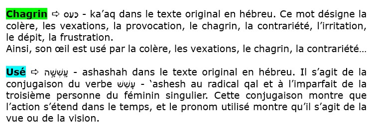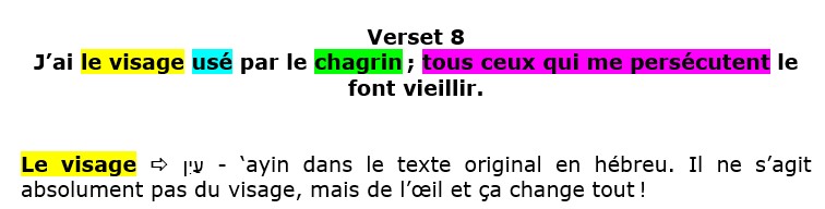Et là, on comprend que c’est le sens de la vue qui a fait chuter David. Il a regardé, puis convoité, et c’est de la convoitise que naît le péché. Cependant, David ajoute que son œil est usé par le chagrin, c’est-à-dire qu’il fonctionne mal à cause de son chagrin.