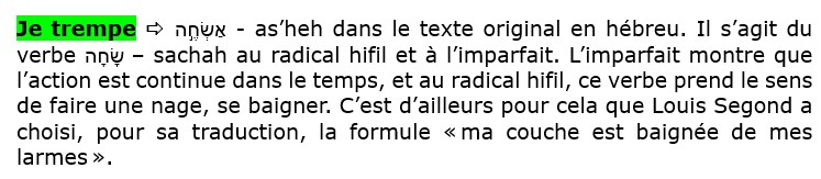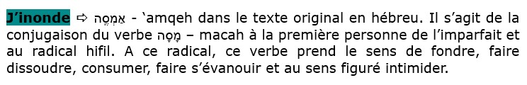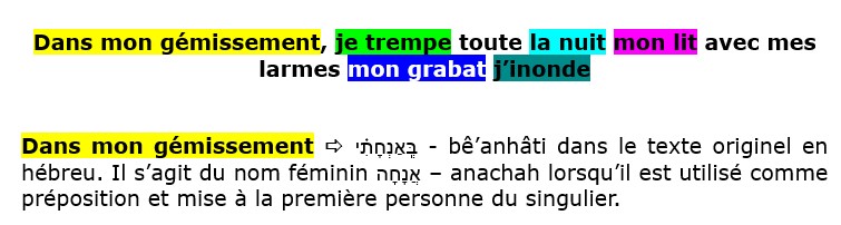 Mais, ça ne fonctionne pas, car ce verbe est conjugué à la première personne du singulier. Donc, c’est David qui se baigne. C’est David qui se baigne dans ses larmes toute la nuit. Il faut comprendre que David pleure toute la nuit, et ses larmes trempent son lit, certes, mais que spirituellement, il se baigne dans ses larmes, c’est-à-dire qu’il essaie de laver son péché dans l’eau de ses larmes.