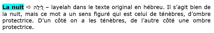 La nuit, c’est le moment où il fait noir, c’est le moment où l’on dort (habituellement), et c’est le moment où Dieu nous répare, nous guérit et grave sa Parole dans notre cœur. Donc, la nuit, qui est considérée par nous comme les ténèbres, est le moment où l’ombre de Dieu veille sur nous.