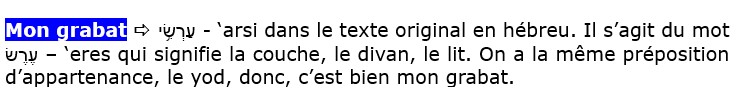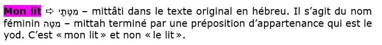 Notons que les deux mots, מִטָּה – mittah et עֶרֶשׂ – ‘eres, désignent tout deux un lit. Cependant, dans le mot מִטָּה – mittah on a une petite connotation de civière sur laquelle on couche les malades, qui n’apparaît pas dans le mot עֶרֶשׂ – ‘eres.