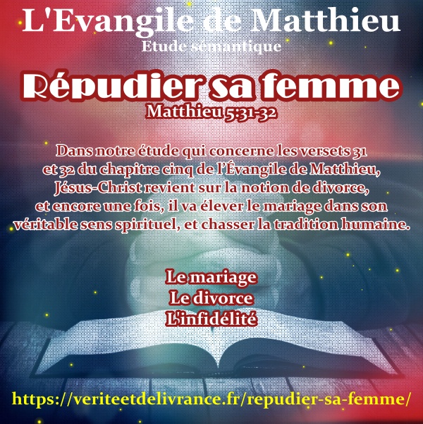 Dans notre étude qui concerne les versets 31 et 32 du chapitre cinq de l’Évangile de Matthieu, Jésus-Christ revient sur la notion de divorce, et encore une fois, il va élever le mariage dans son véritable sens spirituel, et chasser la tradition humaine.