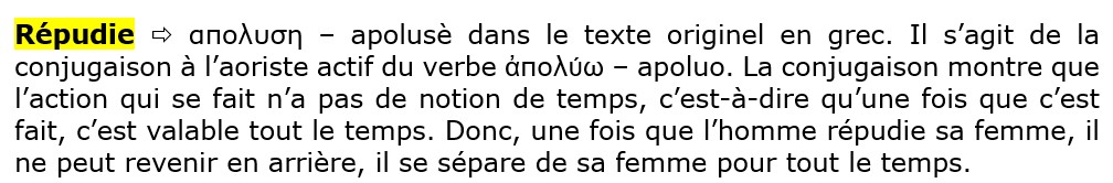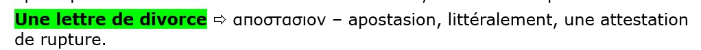 Or, Dieu a lié l’homme et la femme, et ici, l’homme se libère de cette loi divine et décrète lui-même qu’il peut libérer sa femme des liens du mariage. Il y a, dans ce verbe, l’idée d’une séparation, séparation de corps pour la tradition humaine. Qu’en est-il de la séparation spirituelle ? Car, lorsque Dieu lie deux êtres, le lien est spirituel. Or, dans une telle séparation purement physique, de corps, le lien spirituel n’est pas rompu, car nul ne peut rompre ce que Dieu a lié.