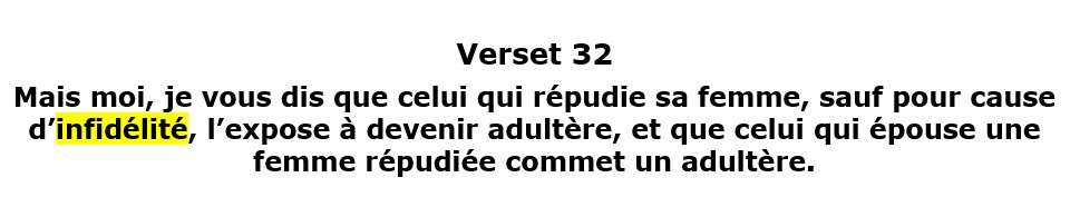 ³²Mais moi, je vous dis que celui qui répudie sa femme, sauf pour cause d’infidélité, l’expose à devenir adultère, et que celui qui épouse une femme répudiée commet un adultère.